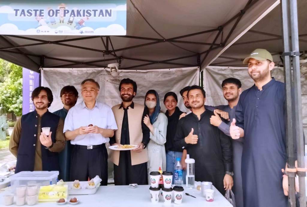 校長鄭道明品嚐巴基斯坦美食,並與學生合影。圖/許俊揚