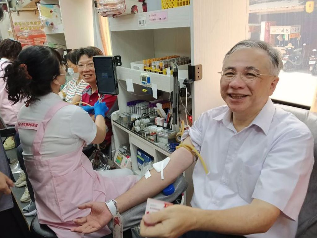 朝陽科大校長鄭道明(右)率先挽袖捐血,展現力挺公益的決心。圖/許俊揚