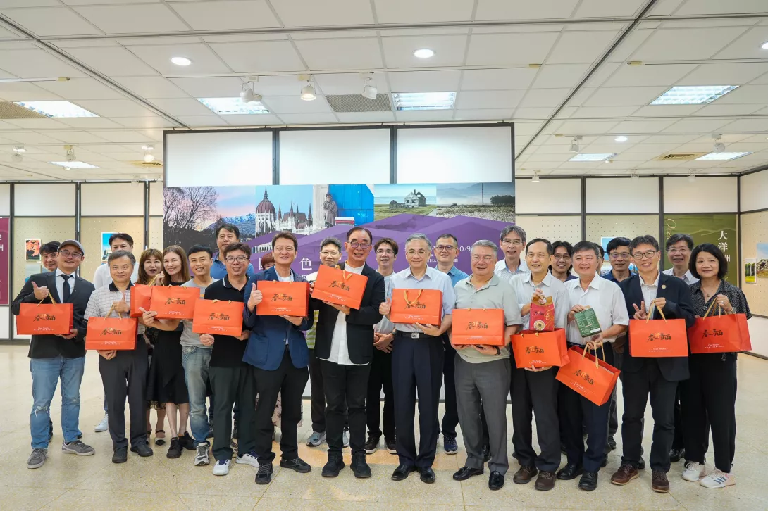 朝陽科技大學校長鄭道明(前排右六)、麗明營造董事長吳春山(前排右七)與眾嘉賓於攝影展合影。圖/許俊揚