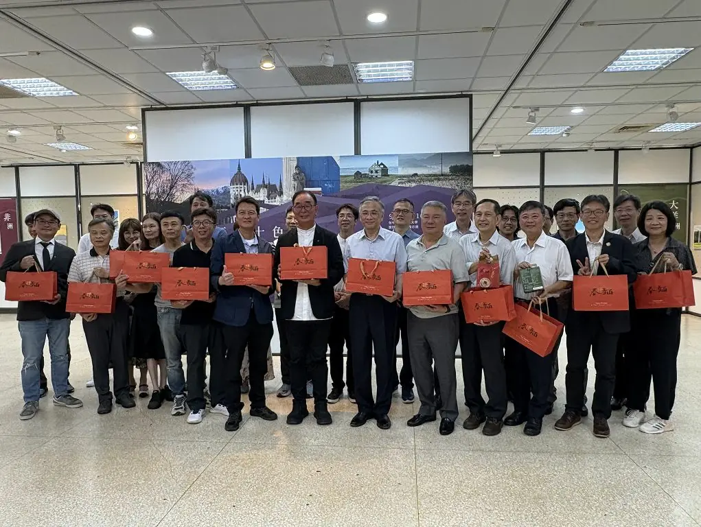 麗明營造董事長吳春山,朝陽科大分享攝影演唱公益實踐典範,與會嘉賓及朝陽師生大合影。
