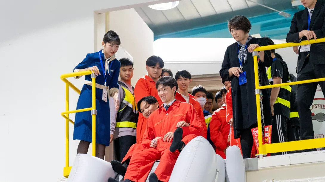 ▲透過客艙緊急逃生情境模擬實作體驗,讓學員了解飛安的重要性。(圖/記者顏淑娟翻攝)