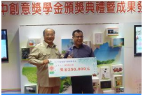 榮獲愛台中創意獎學金大賽發明類金獎之營建系博士生林瑛祥(右)接受台中市長胡志強(左)頒獎表揚。