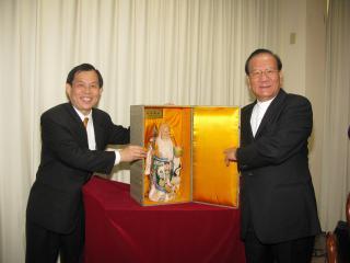 由於適逢創辦人(右)70大壽,鍾任琴校長(左)特別代表學校致贈象徵福祿壽的交趾陶祝壽。