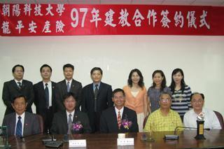 ●副校長陳建勝(前排右三)代表本校與龍平安產物保險公司總經理林炫圻總(前排左二)簽署建教合作約定,加強產學合作,提供學生更多實習及就業機會。