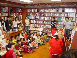 ●為配合「幼兒英語繪本教學」主題教學,開設「溝通式教學」課程之應外系徐碧霙老師(後排左三)特別帶領學生至朝陽書坊,以生動活潑的說故事方式,和附設幼稚園的幼童互動,培養幼兒英語學習的興趣,並提供應外系學生教學實務經驗。