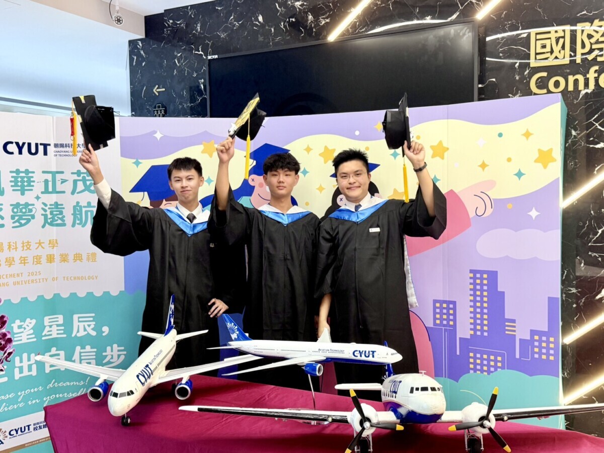 ▲朝陽科大飛航系首屆畢業生,左起:鍾翔宇、蔡奇哲、黃柏豪。(圖/記者顏淑娟攝)