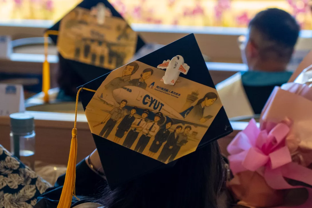 ▲學士帽上的Q版小飛機及象徵飛航專業的圖樣,都是朝陽飛航系師生的巧思。