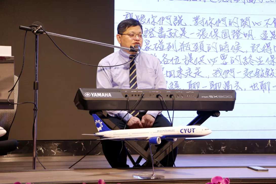 為了籌辦這場畢業單飛儀式,飛航系全系師生動員,除了現場布置滿滿航空元素,合唱曲〈驪語〉更是由系主任盧衍良親自填詞譜曲,讓與會家長深深感動。他用歌詞勉勵所有的畢業生,朝陽科大的畢業證書,就是一張終生保固證明,祝福飛航系畢業學子都能勇敢追夢,攜手共創航空新局。