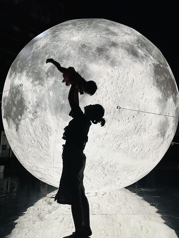 透過逆光拍攝,一對母女在月球球體互動,形成耀眼的剪影效果。