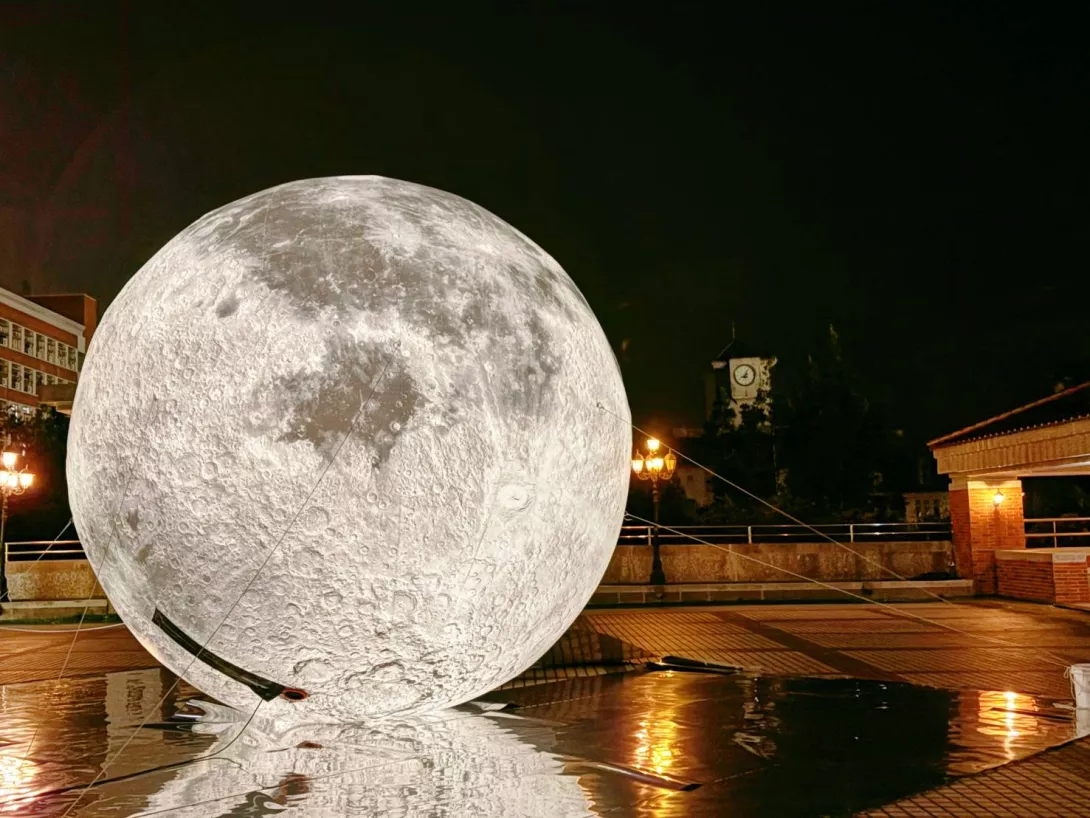 閃亮巨大的月球降落在朝陽設計大樓,入夜後球體散發溫暖光芒,甚至可以清楚看見月球表面的陰影坑洞,十分特別。此外,巨大月球搭配鏡面地毯,出現迷人的月光倒影,充滿浪漫氛圍,成為打卡熱點。