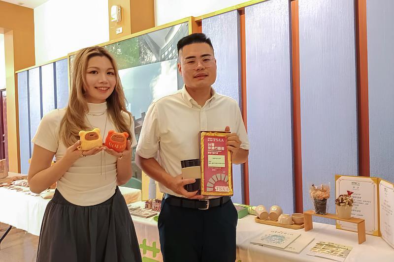成功創業之校友蔡忠諺(右)及蔡秉蓁(左),帶來特色商品「永續肖楠木隨行杯」及受邀參展台灣文博會的「熊熊達摩」,與學弟妹分享。