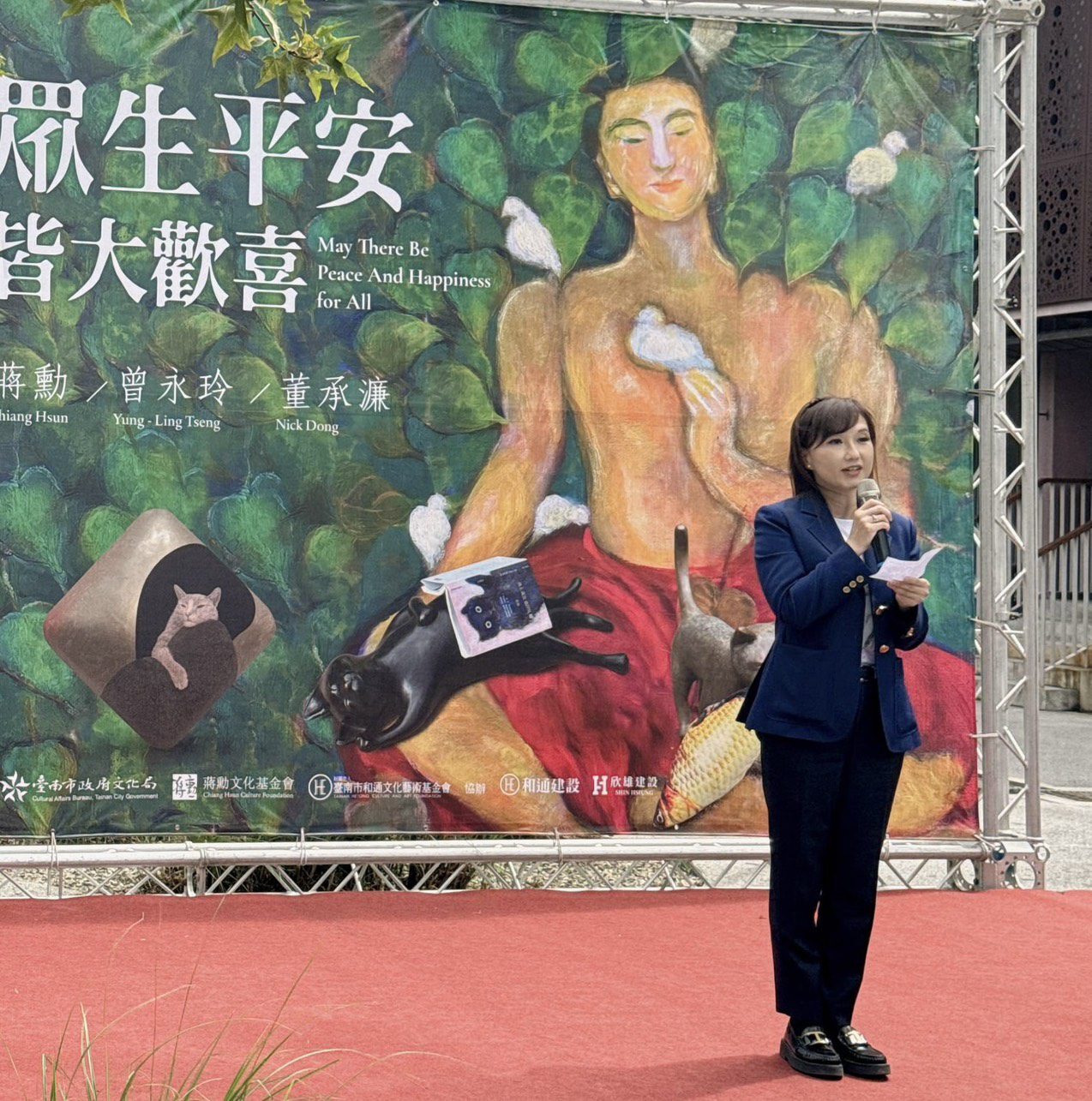 和通文化藝術基金會李怡寧董事長表示,今年臺灣經歷颱風與水患,災情頻傳,讓人心動盪不安。感謝三位藝術家在此時此地,帶來以貓為主角的創作聯展。每一隻貓的眼神與姿態,都像在傳遞一種柔軟、深情而不語的安慰,也如同『怡然』與『寧靜』之間的微光——讓人回到內心最純粹的安穩。更令人驚喜的是,展覽亦結合AI互動體驗,觀眾可以創作個人化影片,留下屬於自己的『皆大歡喜』瞬間。希望這場展覽,能成為人們生活中的一處靜謐角落,讓平安與喜悅,自然而然地流進心田,同時透過藝“文”與佛學的交融,為水交社文化園區增添無限光彩輝煌。