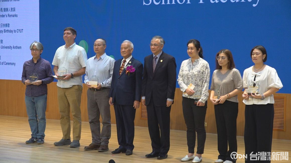 受獎人員在台前列隊,一一從頒獎人手中接過獎狀,表彰他們傑出的成果以及表現,朝陽科技大學今年歡喜迎接32歲生日,這天學校舉辦簡單隆重的慶祝大會。